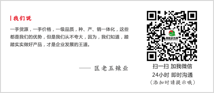 湖南匡老五辣業(yè),30年專(zhuān)注干辣椒批發(fā),如對我們的產(chǎn)品感興趣,歡迎點(diǎn)擊右側客服咨詢(xún)或者撥打400-6628-308,歡迎您的垂詢(xún)!